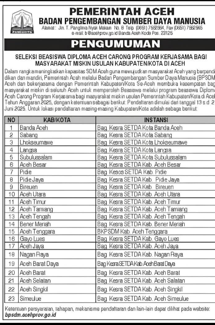 Katacyber.com | Banda Aceh – Pemerintah Aceh melalui Badan Pengembangan Sumber Daya Manusia (BPSDM) kembali membuka peluang beasiswa pendidikan jenjang diploma melalui Program Aceh Carong, khusus bagi masyarakat miskin yang diusulkan oleh pemerintah kabupaten/kota se-Aceh. Program ini merupakan langkah konkret peningkatan kualitas SDM Aceh agar dapat bersaing secara mandiri dan berdaya saing tinggi di masa depan. Kamis, (19/06/2025).