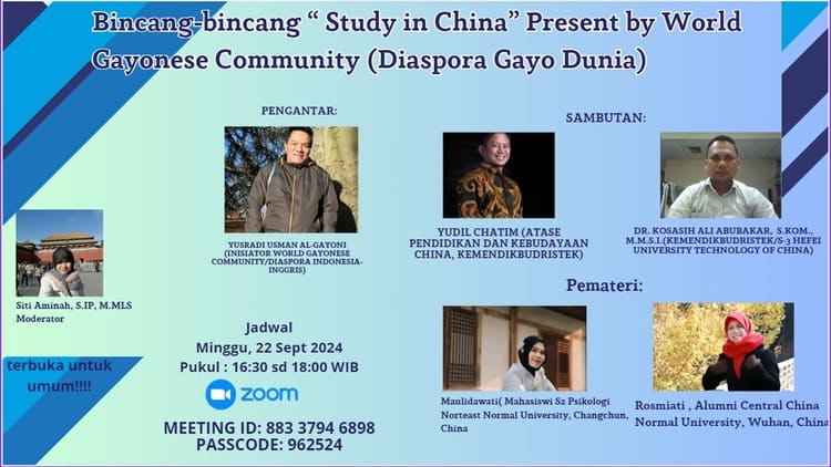 Bincang-bincang “Studi di Tiongkok” World Gayonese Community (Diaspora Gayo Dunia) akan dimulai dengan kata pengatar dari Yusradi Usman al-Gayoni (Inisiator World Gayonese Community/Diaspora Indonesia-Inggris). Setelah itu, sambutan dari Dr. Kosasih Ali Abubakar, S.Kom., M.M.S.I.(Kemendikbudristek/S-3 Hefei University Technology of China) dan Yudil Chatim (Atase Pendidikan dan Kebudayaan China, Kemendikbudristek). Lebih lanjut, kegiatan perbincangan ini bisa diikuti melalui tautan https://us02web.zoom.us/j/88337946898?pwd=cIcFjQCzWdkvo1JxqwtcPVdZcA9ipV.1, dengan Meeting ID: 883 3794 6898 dan Passcode: 962524