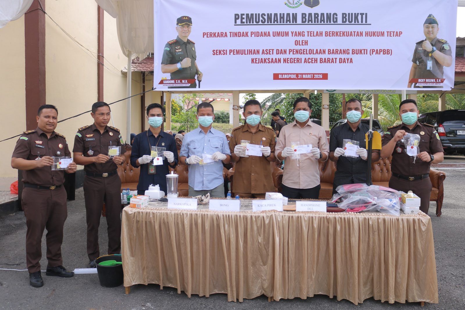 Pemusnahan tersebut dipimpin langsung oleh Kepala Kejaksaan Negeri Abdya, Kardono, SH., MH., didampingi Kepala Seksi Pemulihan Aset dan Pengelolaan Barang Bukti (PAPBB) Ricky Rosiwa, SH., MH., serta Kasi Intelijen dan jajaran lainnya.