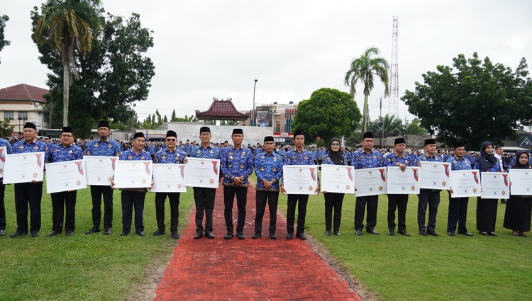 Penyerahan penghargaan ini berlangsung dalam acara Apel Bulanan Pemkab OKI yang digelar pada Senin (20/1/2025) di Halaman Kantor Bupati OKI.