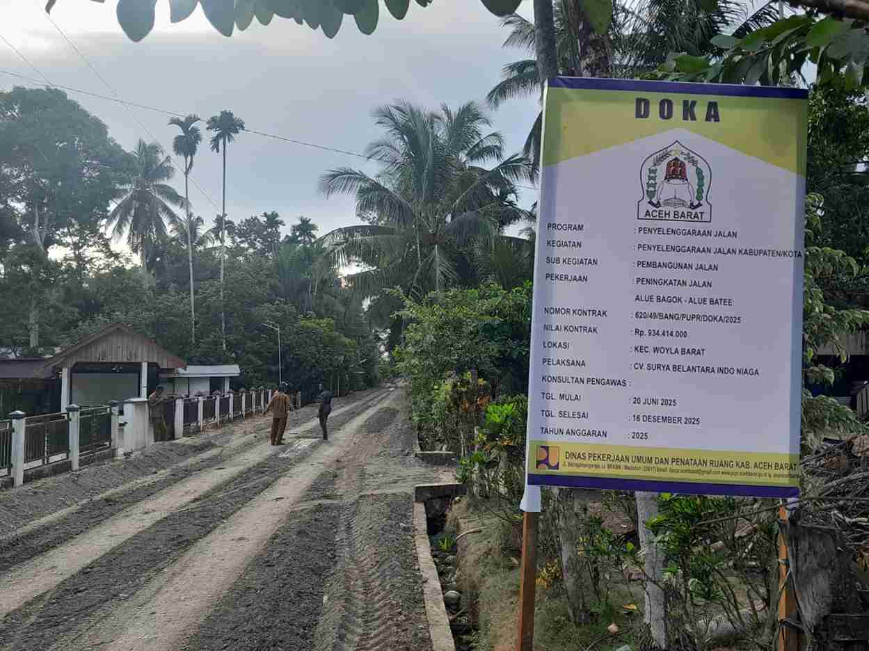 Diketahui proyek peningkatan jalan pada ruas Alue Bagok – Alue Batee di Kecamatan Woyla Barat sedang dalam tahap pengerjaan, dengan penggunaan sumber anggaran berasal dari Dana Otonomi Khusus Aceh (DOKA). Proyek ini digarap oleh CV. Surya Belantara Indo Niaga dengan nilai kontrak sebesar Rp934.414.000.