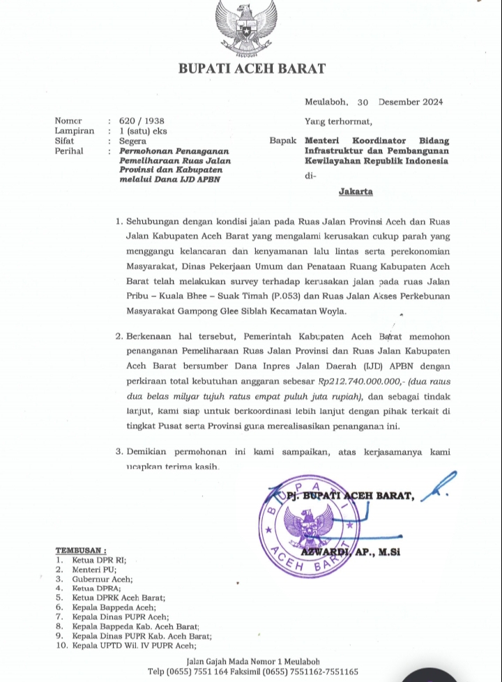 Berdasarkan surat usulan Pemkab Aceh Barat pada tanggal 30 Desember 2024 lalu kepada Menteri Koordinator Bidang Infrastruktur dan Pembangunan Kewilayahan (Menko Infra) Republik Indonesia dengan nomor surat : 620/1938 dengan jumlah berkas : 1 (satu) eks yang bersifat segera dengan maksud Pemeliharaan Ruas Jalan Provinsi dan Kabupaten melalui Dana IJD APBN.