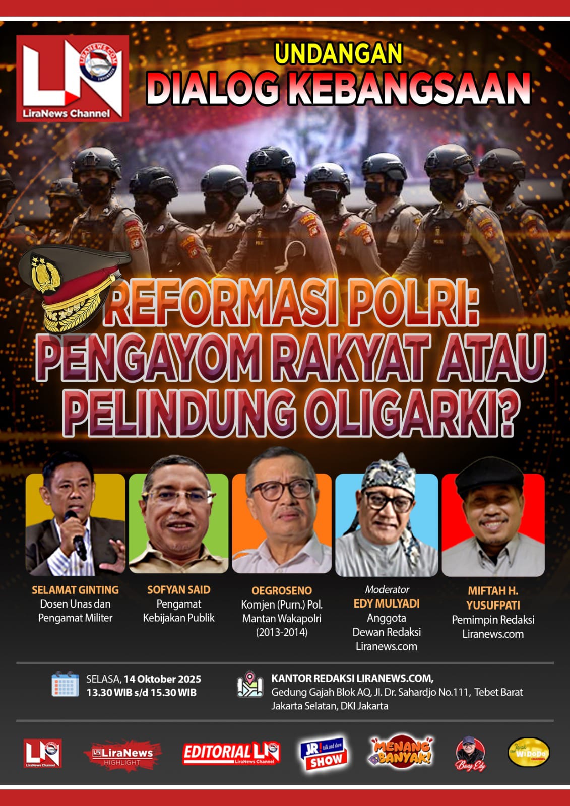 Katacyber.com | Jakarta – Diskusi publik mengenai arah reformasi Kepolisian Republik Indonesia (Polri) kembali mengemuka dalam sebuah dialog interaktif bertajuk “REFORMASI POLRI: PENGAYOM RAKYAT ATAU PELINDUNG OLIGARKI”. Dialog tersebut menyoroti tantangan besar yang dihadapi institusi Polri dalam memenuhi ekspektasi masyarakat sebagai pelindung dan pengayom sejati. Kegiatan ini berlangsung di Kantor Redaksi LiraNews, Tebet Barat, Jakarta Selatan. Selasa (14/10/2025).